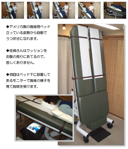 妊婦さんになってから体の痛みを訴える方も少なくありません。当院では、外出が可能な体調であればいつでも受けることが可能です。妊婦さんと施術ベッドの画像をご紹介します。