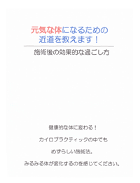 施術者が個々のクライアント様の条件に合ったアドバイスを小冊子に記入して差し上げております。改善の近道を分かりやすくまとめましたので、新患様はこれをご参考に早く元気になりましょう!