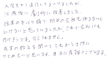 入院先から直行してまいりましたが、施術後に劇的に改善しました。強度のぎっくり腰で明日は会社も休まないといけないと思っていましたが、これで会社にも行けそうです。信じられません。先生の教えを聞いて、これから予防につとめたいと思います。本当に有難うございます。