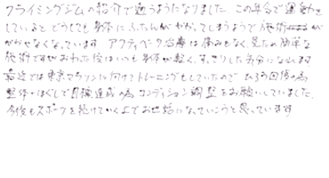 クライミングジムの紹介で通うようになりました。この年令で運動をしていると、どうしても身体に負担がかかってしまうようで施術がかかせなくなっています。アクティベータ施術は痛みもなく見ため簡単な施術ですが、終わった後は、いつも身体が軽く、すっきりした気分になれます。最近では東京マラソンに向けてトレーニングもしていたので、疲労快復の為、整体+ほぐしで目標達成の為コンディション調整をお願いしていました。今後もスポーツを続けていくのでお世話にいこうと思っています。